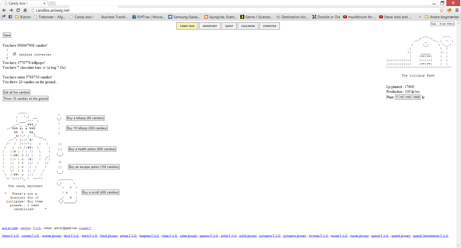 GumZ1110 wrote:Hvis man klikker på slikkepinden falder prisen på dem, og klikker man på hans hat får man 100 candy mener jeg det er