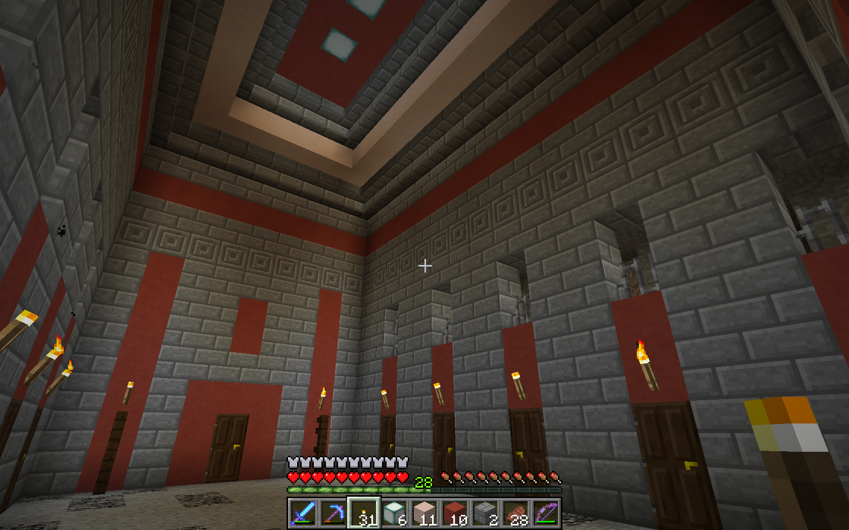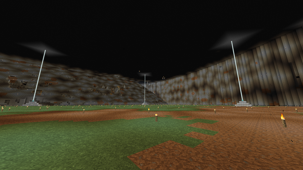 Dette er selve hovedbygningen, hvor vi ændrede hvælvingerne i den store sal. Her udskiftede vi cobblestone med farvet clay, og indsatte lysende græskar i kanterne, så loftet blev synligt. Desuden udgravede vi en indsejlingskanal i den lange længe, hvor du (hvis du kigger godt efter) kan se at alle hvælv blev hævet op inden under det tag vi byggede. Inde i denne kanal kan skibe altså sejle ind i slottet og lægge til havn med sin last