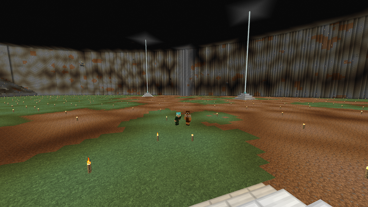 Dette er selve hovedbygningen, hvor vi ændrede hvælvingerne i den store sal. Her udskiftede vi cobblestone med farvet clay, og indsatte lysende græskar i kanterne, så loftet blev synligt. Desuden udgravede vi en indsejlingskanal i den lange længe, hvor du (hvis du kigger godt efter) kan se at alle hvælv blev hævet op inden under det tag vi byggede. Inde i denne kanal kan skibe altså sejle ind i slottet og lægge til havn med sin last