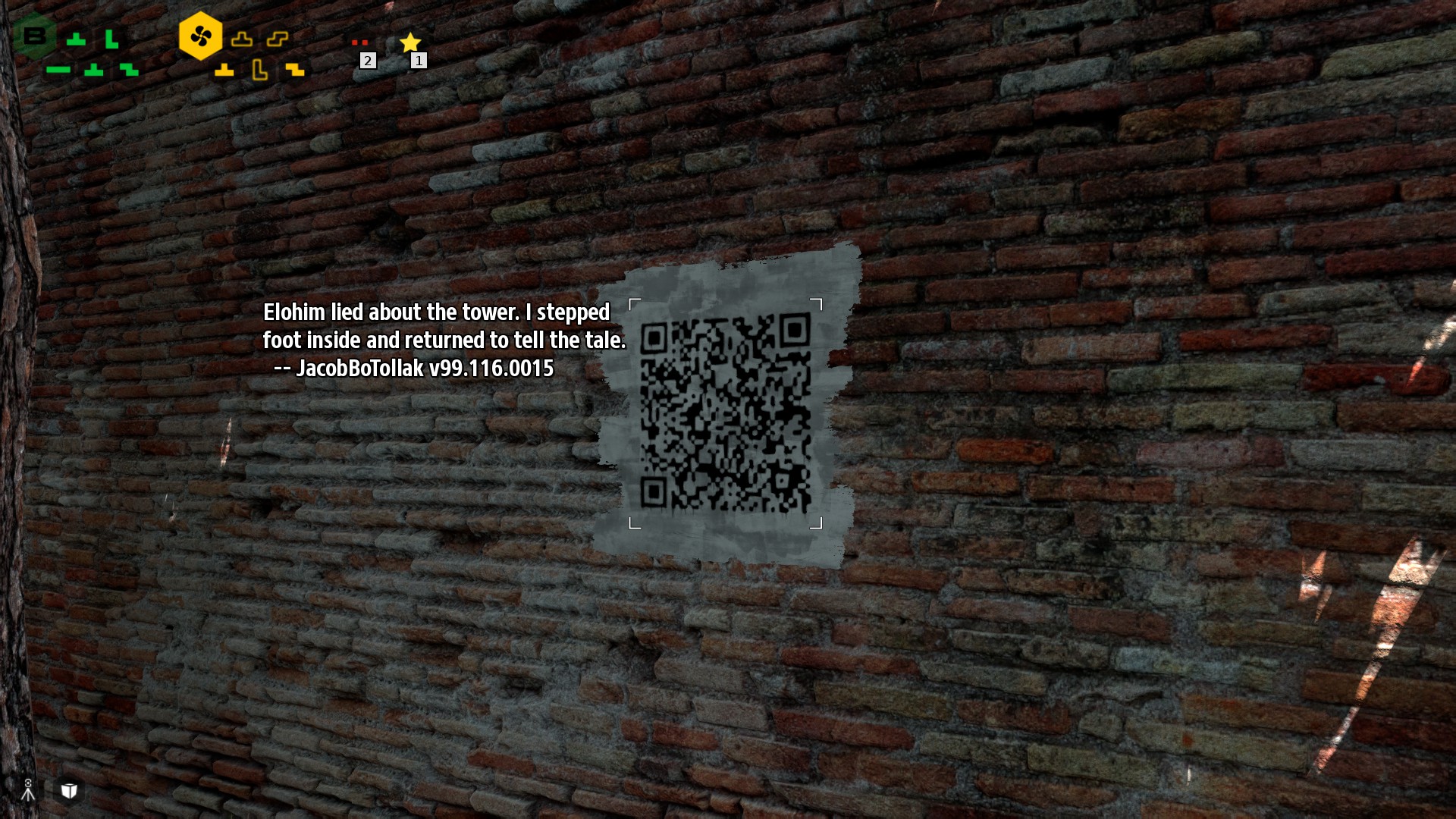 Jeg sidder altså der og har det virkelig fedt over stemningen, udfordringerne og den slet skjulte nørdehumor i spillet. Jeg kommer så forbi en QR kode på en væg, det er der ikke noget udsædvaligt i, de er rundt omkring, men da jeg kiggede på denne faldt bomben: