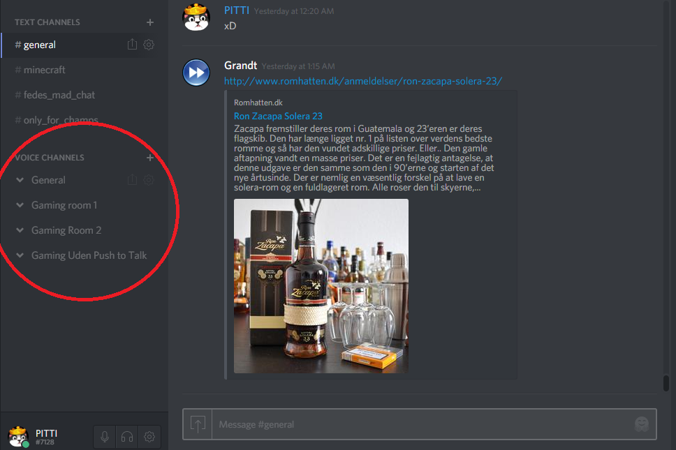Lad os kigge på Mumble, hvor man skal vælge servere. Dette fungere i et seperat vindue, og jeg synes det er meget bøvlet i forhold til Discords metode, som kan ses på billede nr 2 Her på billede nr 2, kan man tilføje og fjerne servere, og du skifter servere, blot ved at trykke på ikonet/billedet, og derefter det rum du gerne vil joine på den på gældene server. Lad os kigge på chatten i Mumble... Hvad er der at sige? Det er oldschool kedelig chat, med en dame der sidder og læser op, hvis ikke man har fået slået tekst til tale fra. Ud over det så er der vidst noget bøvl med links, hvor man ikke kan trykke direkte på det andre sender, men man skal copy paste det ind i sin browser. Hvis vi ser på Discord chatten, så har man en chat historik, hvor man kan scrolle op og ned, man kan have flere forskellige chat rum alt efter emne, og man kan deltage i en chat på en server, mens man snakker på en anden. Ligeledes er der private chat, hvor man kan skrive med sine venner fra nær og fjern. (Billede 5), Og man for en fin notifikation hvis man for en ny besked man ikke har læst (Billede 6)