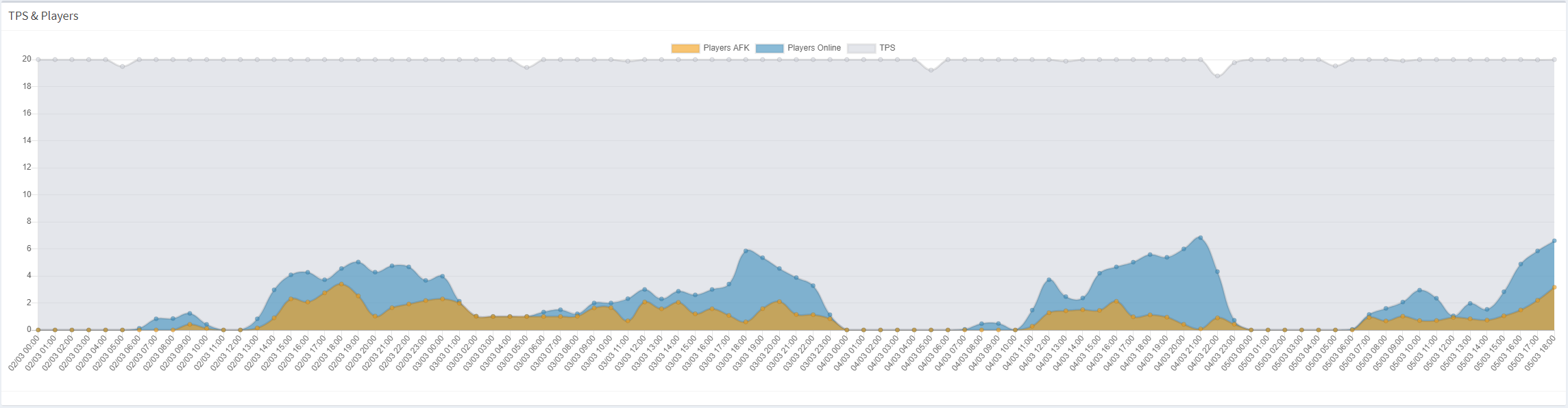 Ligeledes hører vi meldinger fra spillere om at de syntes serveren har kørt bedre den seneste tid. Her er en måling der viser at TPS stort set er stabil siden skiftet til PaperMC: